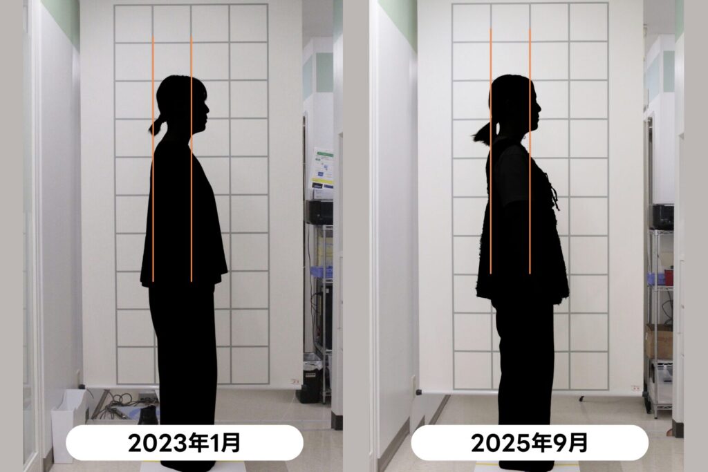 見かけをよくするというより、主訴である奥歯のかみ合わせにの不調に対してかみ合わせのバランスをとることを主目的として歯を動かしました。全身の不調に対しては積極的に治療は行っていませんが、結果的に改善が認められました。全身写真の比較でもバランスが取れてきていることが認められます。(これは個人差があります。)