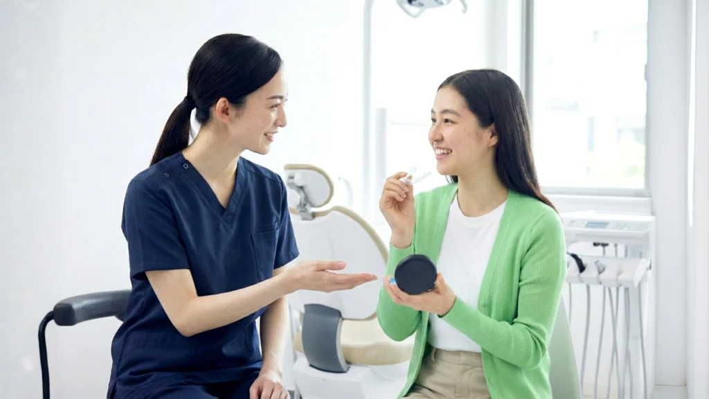 マウスピース矯正は、ワイヤー矯正に比べて通院の回数は少なくなることが期待できますが、それでも矯正がどこまで進んでいるかを定期的に診て調整をしていきます。