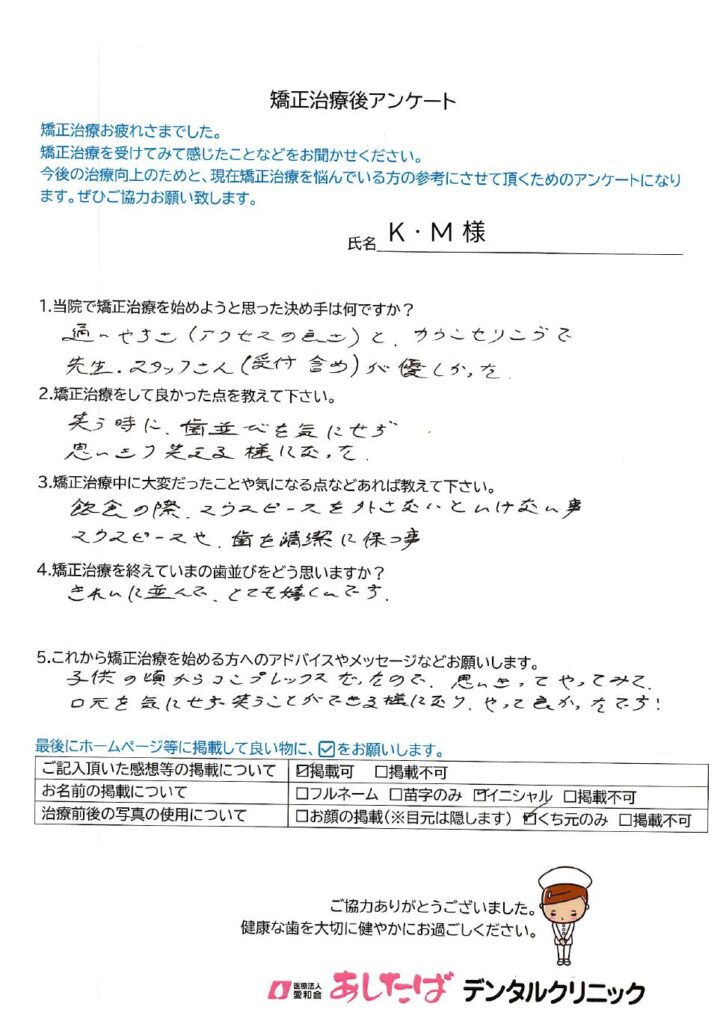 A. 私は年齢がだいぶいっているので矯正を迷う気持ちもありましたが、やってみて本当によかった。歯並びのコンプレックスを一生持ち続けることなく思い切ったチャレンジしてよかったです。