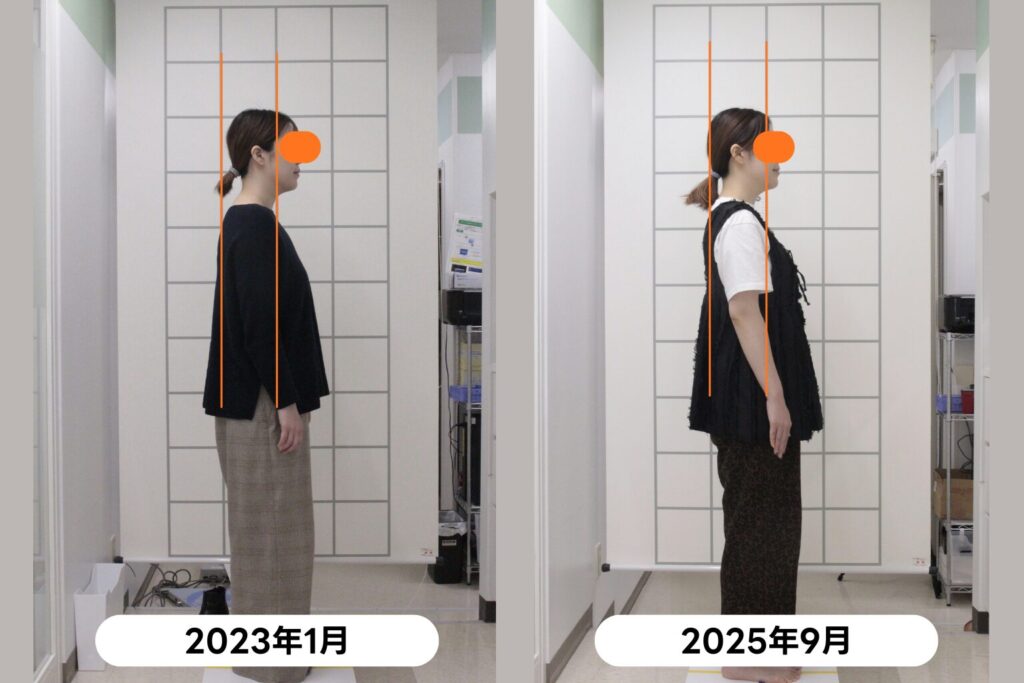 見かけをよくするというより、主訴である奥歯のかみ合わせにの不調に対してかみ合わせのバランスをとることを主目的として歯を動かしました。全身の不調に対しては積極的に治療は行っていませんが、結果的に改善が認められました。全身写真の比較でもバランスが取れてきていることが認められます。(これは個人差があります。)